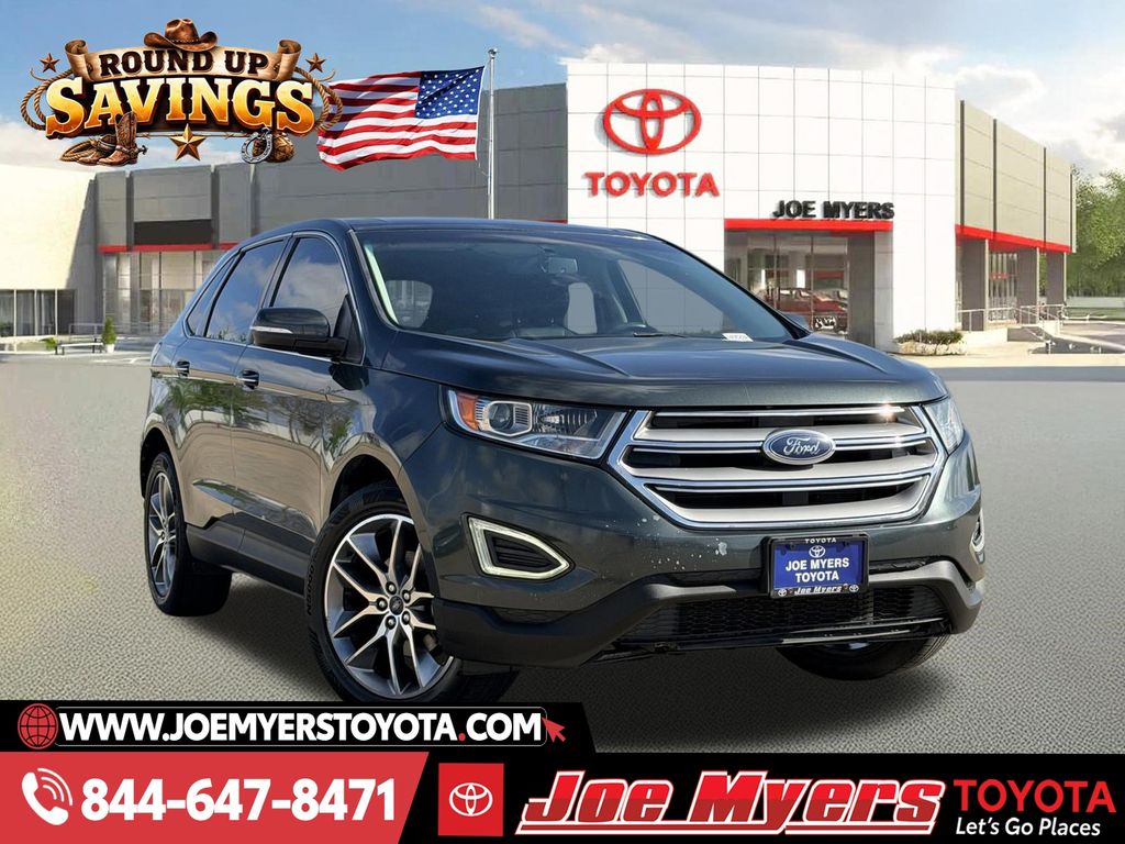 **BLUE TOOTH**, **BACK UP CAMERA**, **LEATHER INTERIOR**, **ALLOY WHEELS**, **SUNROOF**. 2015 Ford Edge Titanium w/ Leather/ Panoramic Roof Guard Metallic FWD 6-Speed Automatic with Select-Shift 18/26 City/Highway MPG 3.5L V6 Ti-VCT JOE MYERS TOYOTA NAMED A CARFAX TOP-RATED DEALER SEVEN YEARS IN A ROW!!! COME EXPERIENCE JOE MYERS TOYOTA**SAVE Time and $Money, FRESH QUALITY INVENTORY EVERYDAY, DAILY SPECIALS!! @JOE MYERS TOYOTA WE ARE HERE FOR YOU!!! Se Habla EspanÌ?ol, Financing Available, VOLUME DEALER, BEST DEALS**Call Now! Recent Arrival! 18/26 City/Highway MPG Awards: * 2015 IIHS Top Safety Pick * 2015 KBB.com Brand Image Awards All pricing is subject to change and may not include dealer added options.. Joe Myers Toyota is proudly serving Houston, Spring, Katy, Cypress, 290 HWY, FM1960, area and follow communities, Northwest Freeway, Cy Fair, Jersey Village, Tomball, The Woodlands, North Freeway, Klein, I-10, Katy, Missouri City, Sugarland, Waller, Brenham, Hempstead, Richmond, and College Station. Reviews: * Sophisticated ride quality room for five and their stuff quality cabin materials efficient base engine powerful Sport model many available technology features. Source: Edmunds