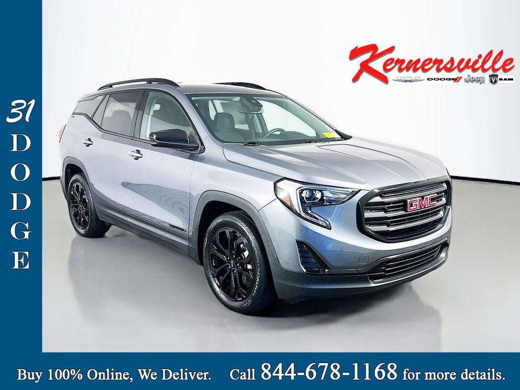 This 2020 GMC Terrain SLE front wheel drive offers modern turbocharged efficiency, advanced driver assistance technology, and comfortable everyday versatility in a stylish compact SUV. Powered by a responsive 1.5L turbocharged four cylinder engine paired with a smooth shifting 9 speed automatic transmission, this Terrain delivers excellent fuel economy and confident performance for commuting, road trips, and daily driving. Inside the cabin, the Terrain features a well designed interior with a leather wrapped steering wheel, power driver window with express up and down, a driver information display, convenient storage solutions, and a six speaker audio system for clear sound throughout the vehicle. Technology highlights include the GMC infotainment system with a 7 inch touchscreen display, Apple CarPlay and Android Auto smartphone integration, Bluetooth audio streaming, voice command capability, and multiple USB ports for device charging and connectivity. Safety features are extensive and include GMC Pro Safety with automatic emergency braking, forward collision alert, lane keep assist with lane departure warning, following distance indicator, front pedestrian braking, rear vision backup camera, stability control, traction control, and tire pressure monitoring with tire fill alert. The Elevation Edition package enhances the exterior appearance with bold styling elements including 19 inch gloss black aluminum wheels, a darkened front grille, black roof rails, and black exterior accents that give the Terrain a more aggressive look. With efficient turbocharged performance, advanced safety technology, modern smartphone connectivity, and distinctive styling, this GMC Terrain SLE is an excellent SUV for drivers looking for practicality, comfort, and technology in one refined package.